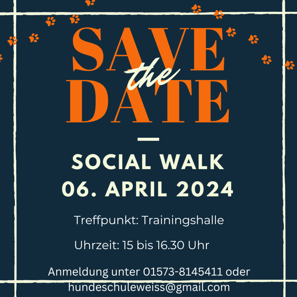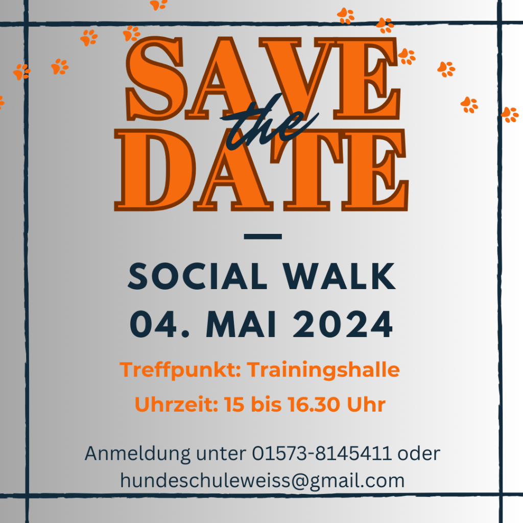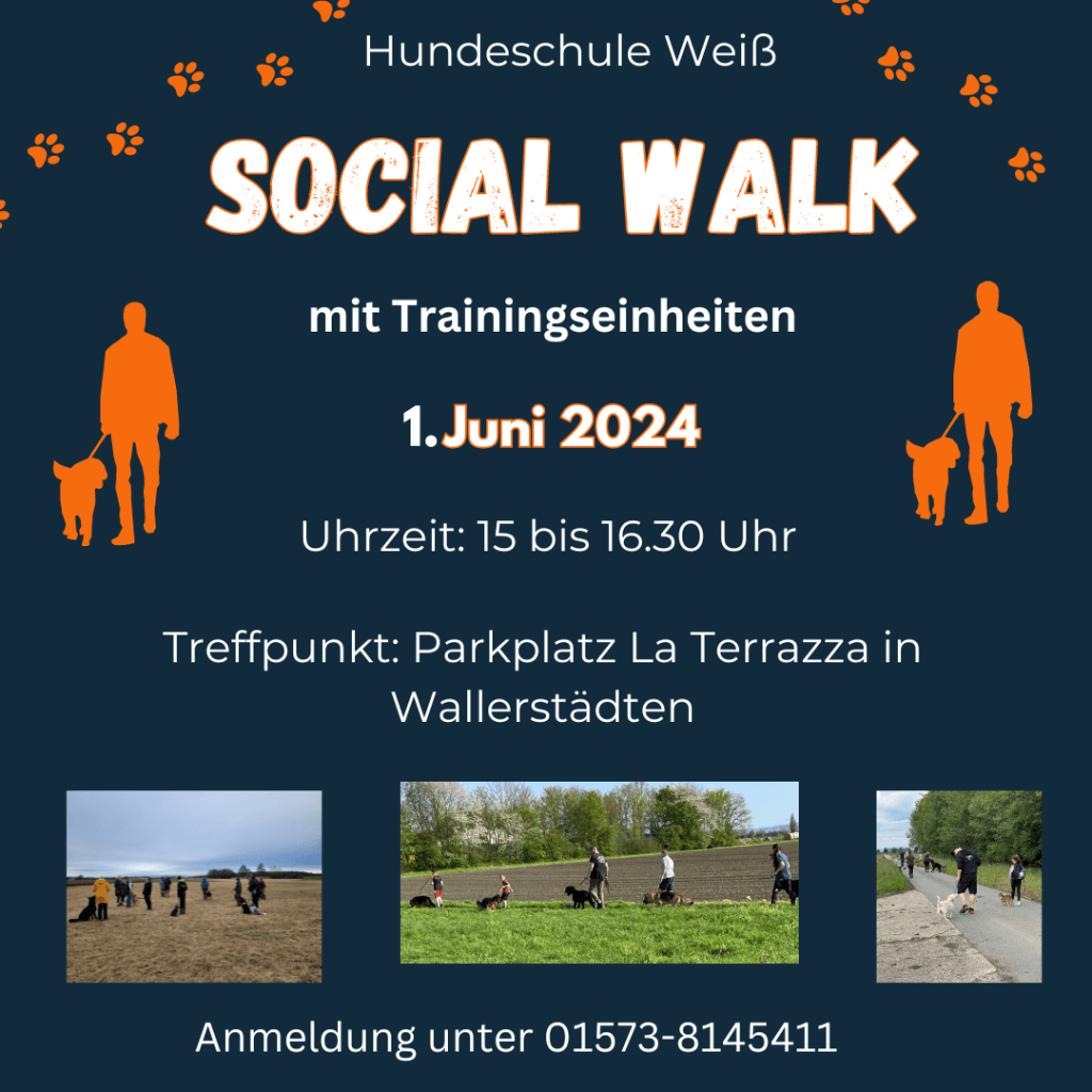 Der Mai steht vor der Tür und damit auch unser nächster Social Walk. Jeden ersten Samstag im Monat machen wir uns gemeinsam auf ins Feld. Bei einer großen Gassirunde üben wir die Leinenführigkeit sowie Hundebegegnungen. Außerdem legen wir unterwegs zwei bis drei Übungsstopps ein, um nochmal an den Grundkommandos unter Ablenkung zu arbeiten. Wir freuen uns immer über neue Gesichter. Wenn ihr also Zeit und Lust habt, dann meldet euch gerne!