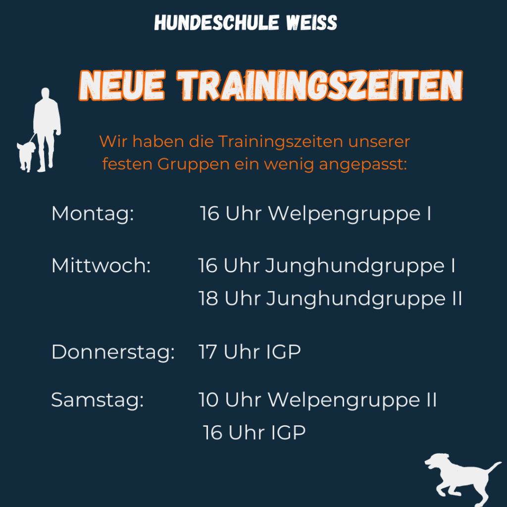 Wir haben unsere Trainingszeiten ein wenig verändert und angepasst. Aktuell wird in der Hundeschule Weiß zu folgenden Zeiten trainiert: